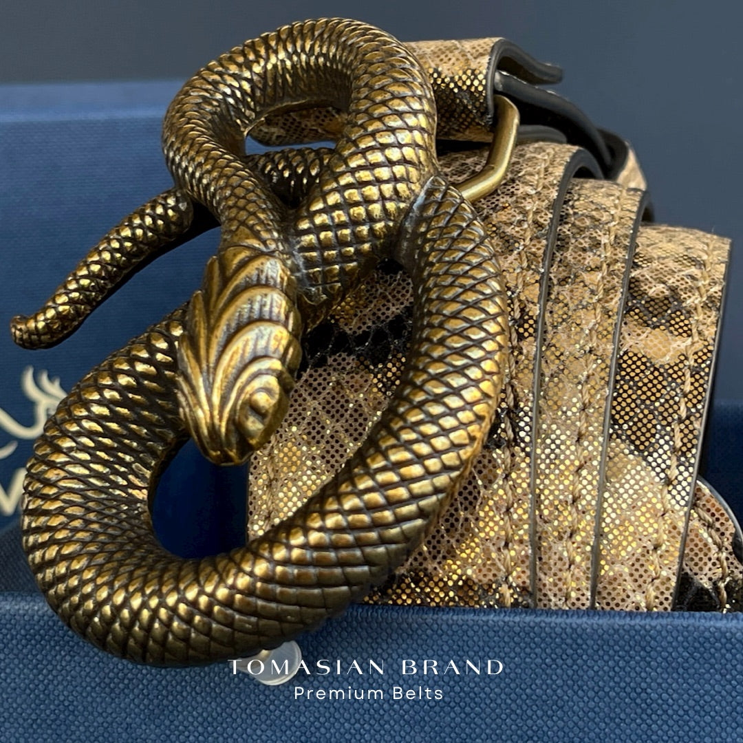 Cintura realizzata in pelle liscio di alta qualità , nero , caratterizzata dalla fibbia "SERPENTE" in ottone colore bronzo.