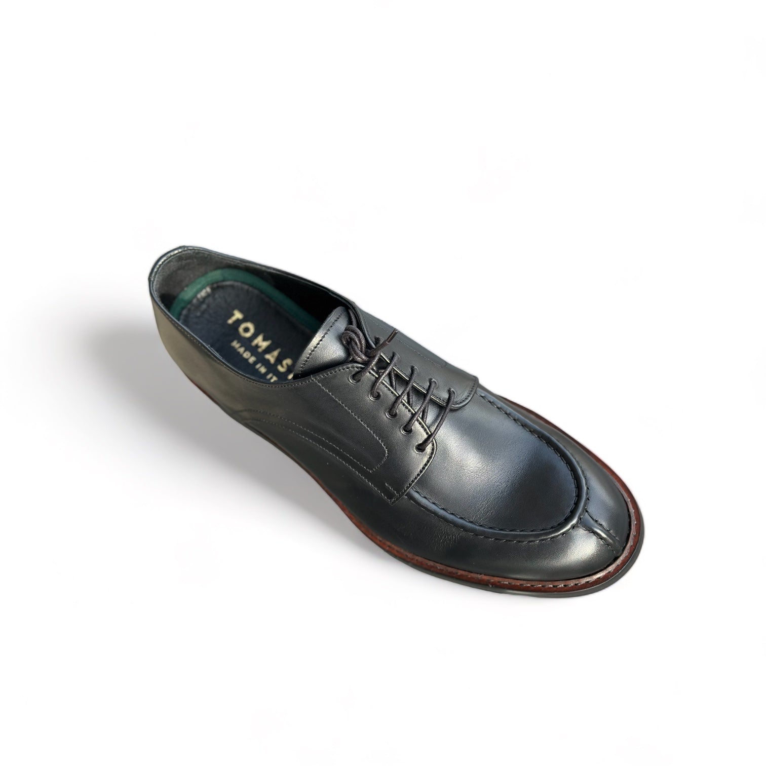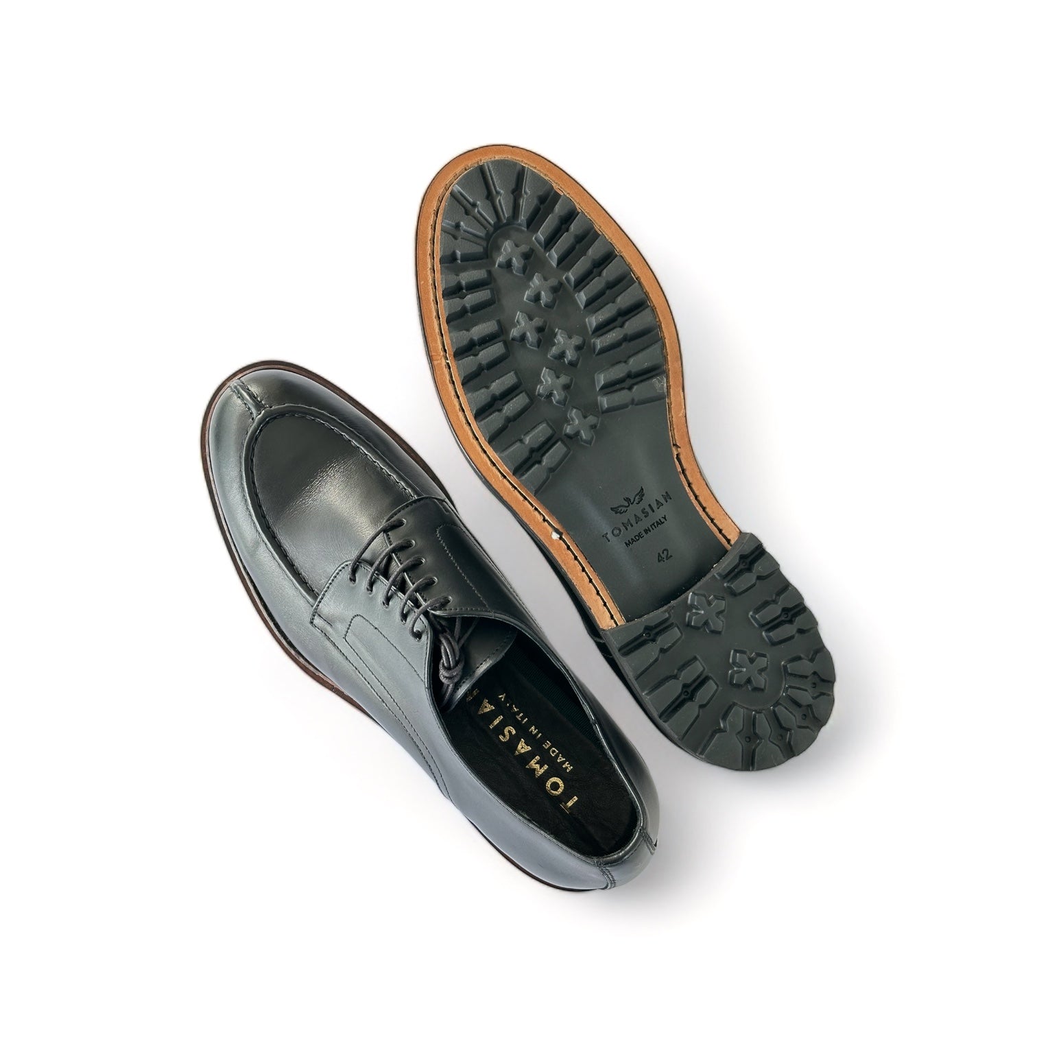 Scarpe di uomo "Derby" in pelle di vitello , la fodera intera in pelle di vitello , sottopiede morbido e certificato come prodotto farmaceutico , caratterizzata da una suola in cuoio e EVA di antiscivolo .