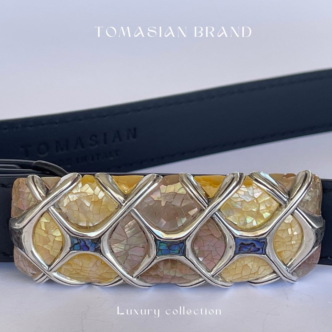 Cintura UNISEX realizzata in pelle liscia nera di alta qualità , caratterizzata dalla fibbia "SAHARA PEARL" in ottone e madre perla colore oro , blue e argento.